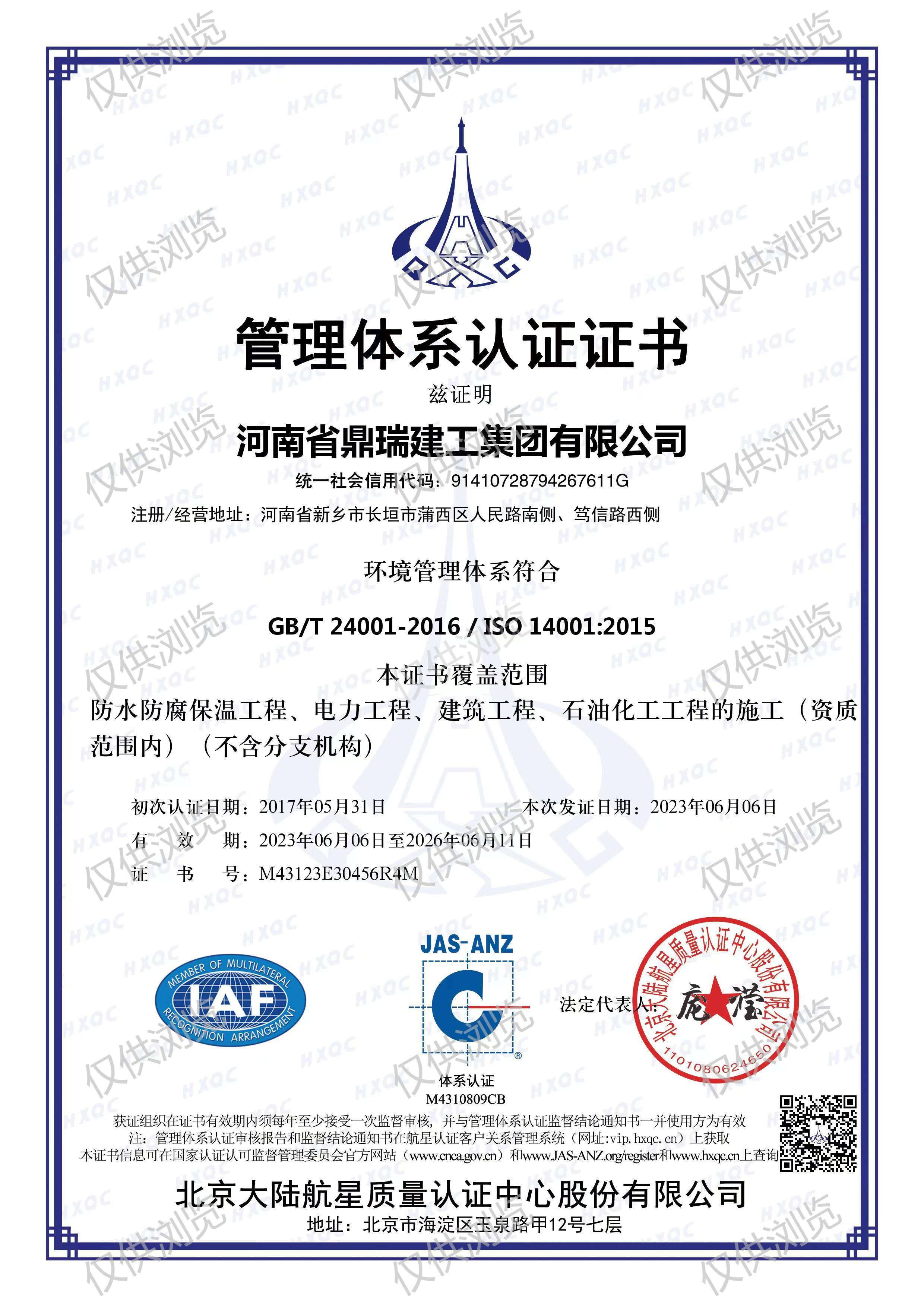 環境管理體系認證證書